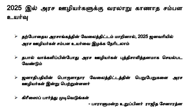 கடந்த அமைச்சரவைக் கூட்டத்தில் வரலாற்றுச் சிறப்புமிக்க முடிவு எடுக்கப்பட்டது. அது அரச சேவையின் அடிப்படை சம்பளத்தை இரட்டிப்பாக்குவது மற்றும் சம்பளத்தை அதிகரிப்பது தொடர்பானது. இதன்படி, 2025 ஆம் ஆண்டு ஜனவரி முதலாம் திகதி முதல் அரச சேவையாளர்களின் சம்பளத்தை எவ்வாறு அதிகரிப்பது என்பது தொடர்பில் அமைச்சரவையில் தீர்மானம் எடுக்கப்பட்டுள்ளது.