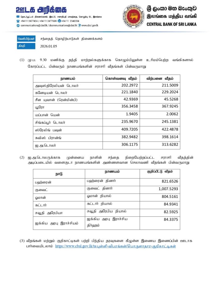 Homeஉள்நாடு உள்நாடுசெய்திவணிகம் இன்றைய (05.01.2026) நாணய மாற்று விகிதம் January 5, 2026 Share FacebookTwitterPinterestWhatsAppTelegramViber தேயிலை தொழிற்சாலைக்குள் அதிரடியாக புகுந்த அமைச்சர் ஜீவன்!02:50 ரூ. 1,700 இல்லையேல் தக்க பாடம் புகட்டுவோம்! தோட்ட தொழிலாளர்கள் கொந்தளிப்பு03:37 வெடுக்குநாறி மலை சிவராத்திரி பூஜையை, இனவாதம் ரீதியில் விமர்சித்த விமல்!04:13 தொல்பொருள் திணைக்கள அதிகாரிகளின் அடாவடி! வவுனியாவில் அட்டகாசம்! வெளுத்து வாங்கிய சாணக்கியன்07:58 மதச் சுதந்திரம் வடக்கிற்கும் தெற்கிற்கும் சமமாக இருக்க வேண்டும்! வெடுக்குநாறி மலைச் சம்பவம்.!07:54 இப்படி ஒரு பண்டிகை இலங்கையில இருக்கா🤭😳😲#news #srilanka #vairalvideo #vairal #malaiyagakuruvi #lka02:55 மலையக மக்கள் இன்னும் ஏமார்ந்து கொண்டிருக்கின்றனர். I தேசிய மக்கள் சக்தியின் தெனியா மாநாடு I NPP11:43 இலங்கை வந்த இளவரசிக்கு ஜனாதிபதி மாளிகையில் வரவேற்பு02:16 நான் மருத்துவராக வேண்டும்! ஊடகங்களிடம் மனம் திறந்த கில்மிசா..03:39 முத்து சப்பரத்தில் இசைக்குயில்....! மேளதாளத்துடன் கோலாகல வரவேற்பு..!!03:05 Related Articles உள்நாடு ஒரே நாளில் பல சாதனைகள் படைத்த பின் ஆலன்! உள்நாடு ஈரான் கப்பல்மீது தாக்குதல்: 87 சடலங்கள் மீட்பு! உலகம் ஈரானின் நீர்மூழ்கி கப்பல் உட்பட 17 போர்க் கப்பல்கள் அழிப்பு: அமெரிக்கா Latest Articles உள்நாடு ஒரே நாளில் பல சாதனைகள் படைத்த பின் ஆலன்! உள்நாடு ஈரான் கப்பல்மீது தாக்குதல்: 87 சடலங்கள் மீட்பு! உலகம் ஈரானின் நீர்மூழ்கி கப்பல் உட்பட 17 போர்க் கப்பல்கள் அழிப்பு: அமெரிக்கா உள்நாடு மரக்கறி விலைப்பட்டியல் (05.03.2026) வெளிநாடு இங்கிலாந்தை வீழ்த்தி இறுதிப் போட்டிக்குள் நுழையுமா இந்தியா? Load more