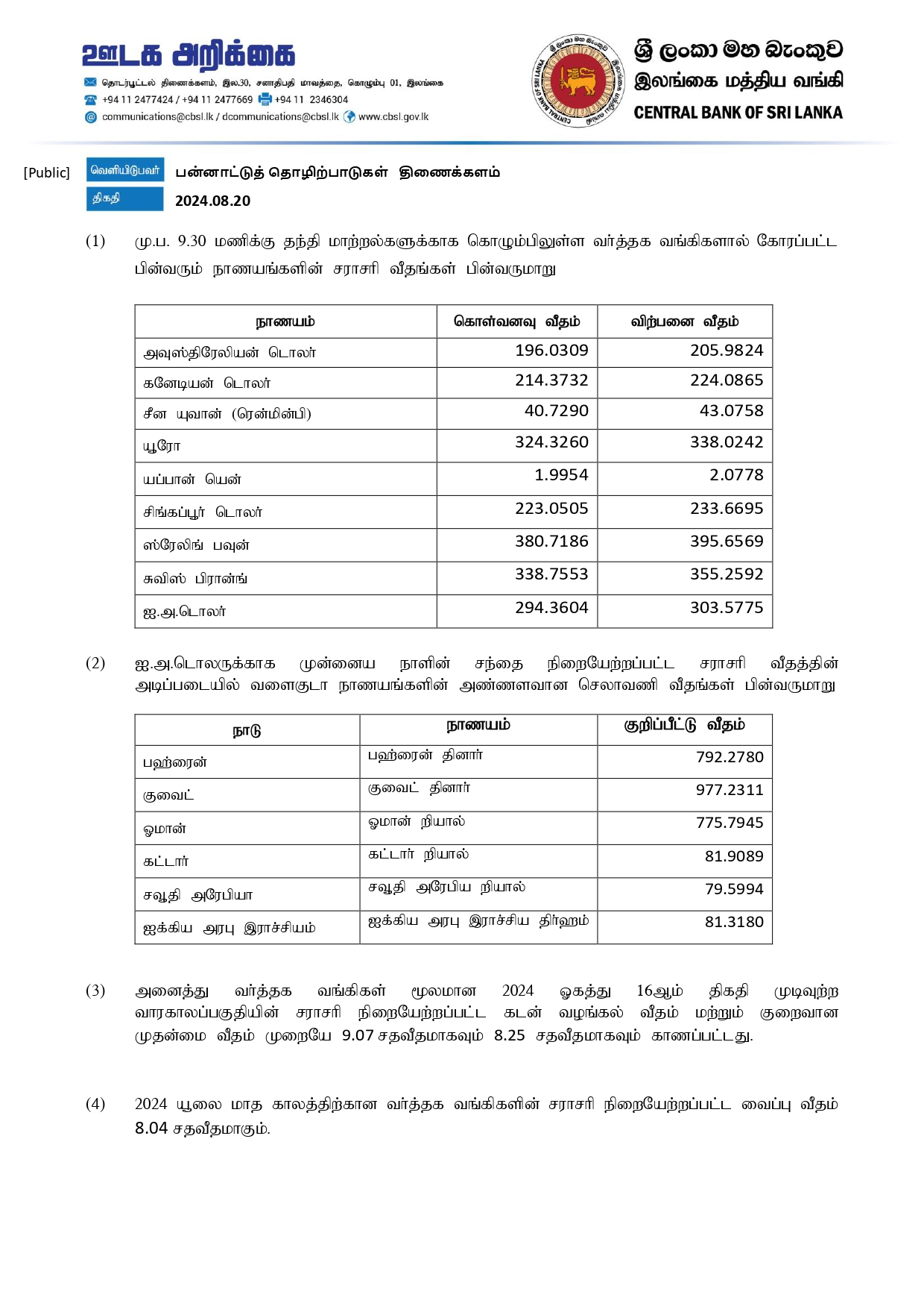 இன்றைய (20.08.2024) நாணய மாற்று விகிதம்