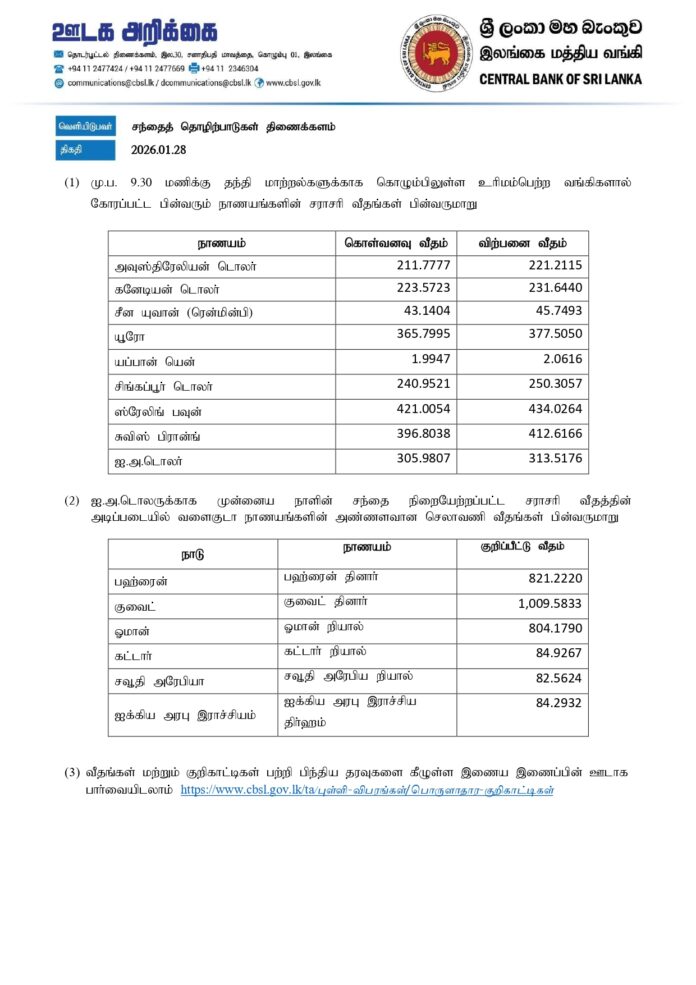 Homeஉள்நாடு உள்நாடுசெய்தி இன்றைய (28.01.2026) நாணய மாற்று விகிதம் January 28, 2026 Share FacebookTwitterPinterestWhatsAppTelegramViber Related Articles உள்நாடு 25 நாட்களுக்குள் 2 லட்சத்துக்கு மேற்பட்ட சுற்றுலாப் பயணிகள் இலங்கை வருகை! சினிமா சிம்பு ஜோடியாகிறார் மிருணாள் தாக்குர்? உள்நாடு கால அவகாசம் கோரிய ஷிரந்திக்கு சமூக பொறுப்பு குறித்து பாடமெடுக்கிறது அரசு! Latest Articles உள்நாடு 25 நாட்களுக்குள் 2 லட்சத்துக்கு மேற்பட்ட சுற்றுலாப் பயணிகள் இலங்கை வருகை! சினிமா சிம்பு ஜோடியாகிறார் மிருணாள் தாக்குர்? உள்நாடு கால அவகாசம் கோரிய ஷிரந்திக்கு சமூக பொறுப்பு குறித்து பாடமெடுக்கிறது அரசு! உலகம் வடகொரியா மீண்டும் ஏவுகணை சோதனை உள்நாடு கிவுல்ஓயா திட்டத்துக்கு எதிராக பெப்ரவரி 2ஆம் திகதியே போராட்டம்: ஏற்பாட்டுக்குழு அறிவிப்பு! Load more