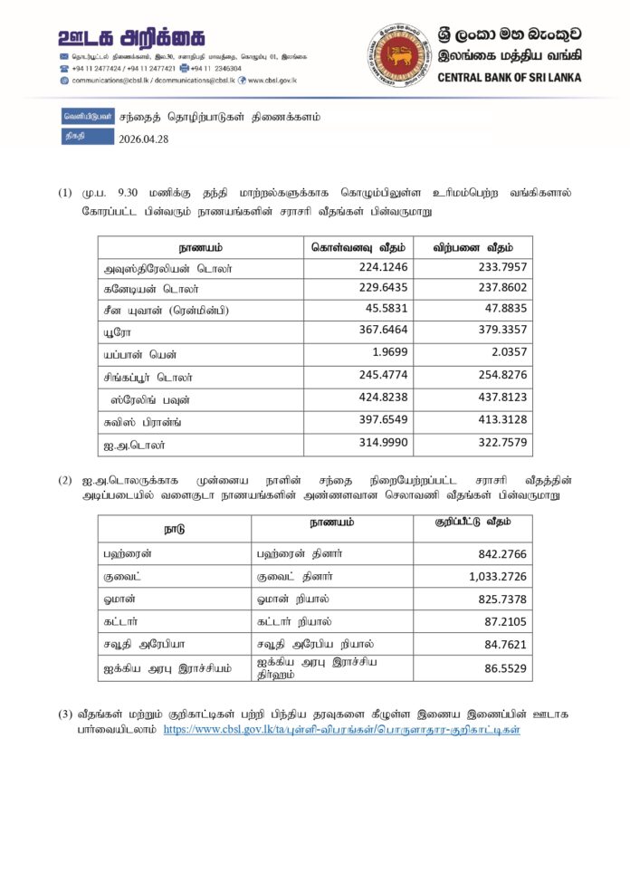 Homeஉள்நாடு உள்நாடுசெய்திவணிகம் இன்றைய (28.04.2026) நாணய மாற்று விகிதம் April 28, 2026 Share FacebookTwitterPinterestWhatsAppTelegramViber தேயிலை தொழிற்சாலைக்குள் அதிரடியாக புகுந்த அமைச்சர் ஜீவன்!02:50 ரூ. 1,700 இல்லையேல் தக்க பாடம் புகட்டுவோம்! தோட்ட தொழிலாளர்கள் கொந்தளிப்பு03:37 வெடுக்குநாறி மலை சிவராத்திரி பூஜையை, இனவாதம் ரீதியில் விமர்சித்த விமல்!04:13 தொல்பொருள் திணைக்கள அதிகாரிகளின் அடாவடி! வவுனியாவில் அட்டகாசம்! வெளுத்து வாங்கிய சாணக்கியன்07:58 மதச் சுதந்திரம் வடக்கிற்கும் தெற்கிற்கும் சமமாக இருக்க வேண்டும்! வெடுக்குநாறி மலைச் சம்பவம்.!07:54 இப்படி ஒரு பண்டிகை இலங்கையில இருக்கா🤭😳😲#news #srilanka #vairalvideo #vairal #malaiyagakuruvi #lka02:55 மலையக மக்கள் இன்னும் ஏமார்ந்து கொண்டிருக்கின்றனர். I தேசிய மக்கள் சக்தியின் தெனியா மாநாடு I NPP11:43 இலங்கை வந்த இளவரசிக்கு ஜனாதிபதி மாளிகையில் வரவேற்பு02:16 நான் மருத்துவராக வேண்டும்! ஊடகங்களிடம் மனம் திறந்த கில்மிசா..03:39 முத்து சப்பரத்தில் இசைக்குயில்....! மேளதாளத்துடன் கோலாகல வரவேற்பு..!!03:05 Related Articles செய்தி இதொகாவின் பிரதான மே தின கூட்டம், பேரணி ரத்து! தோட்டவாரியாக நடத்த ஏற்பாடு! செய்தி “பாரதியன்ஸ் பிரிமியர் லீக்” கிரிக்கெட் போட்டி! உள்நாடு ஆர்ப்பாட்டத்தில் ஈடுபட்டோர் மீது சாணம் வீச்சு! Latest Articles செய்தி இதொகாவின் பிரதான மே தின கூட்டம், பேரணி ரத்து! தோட்டவாரியாக நடத்த ஏற்பாடு! செய்தி “பாரதியன்ஸ் பிரிமியர் லீக்” கிரிக்கெட் போட்டி! உள்நாடு ஆர்ப்பாட்டத்தில் ஈடுபட்டோர் மீது சாணம் வீச்சு! செய்தி டித்வா அனர்த்தத்தினால் வீடுகளை இழந்தவர்களுக்குக் காணி வழங்க பெருந்தோட்ட நிறுவனங்களுடன் பேச்சு உள்நாடு அடுத்த வாரம் இரு நம்பிக்கையில்லாப் பிரேரணைகள்? Load more