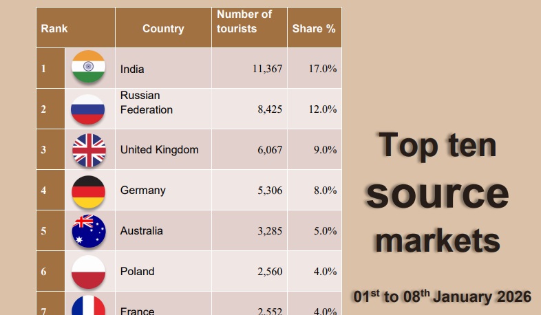 2026 ஆம் ஆண்டில் ஜனவரி 1 முதல் 8 வரையான காலப்பகுதிக்குள் மாத்திரம் 67 ஆயிரத்து 762 சுற்றுலாப் பயணிகள் வருகை தந்துள்ளனர்.