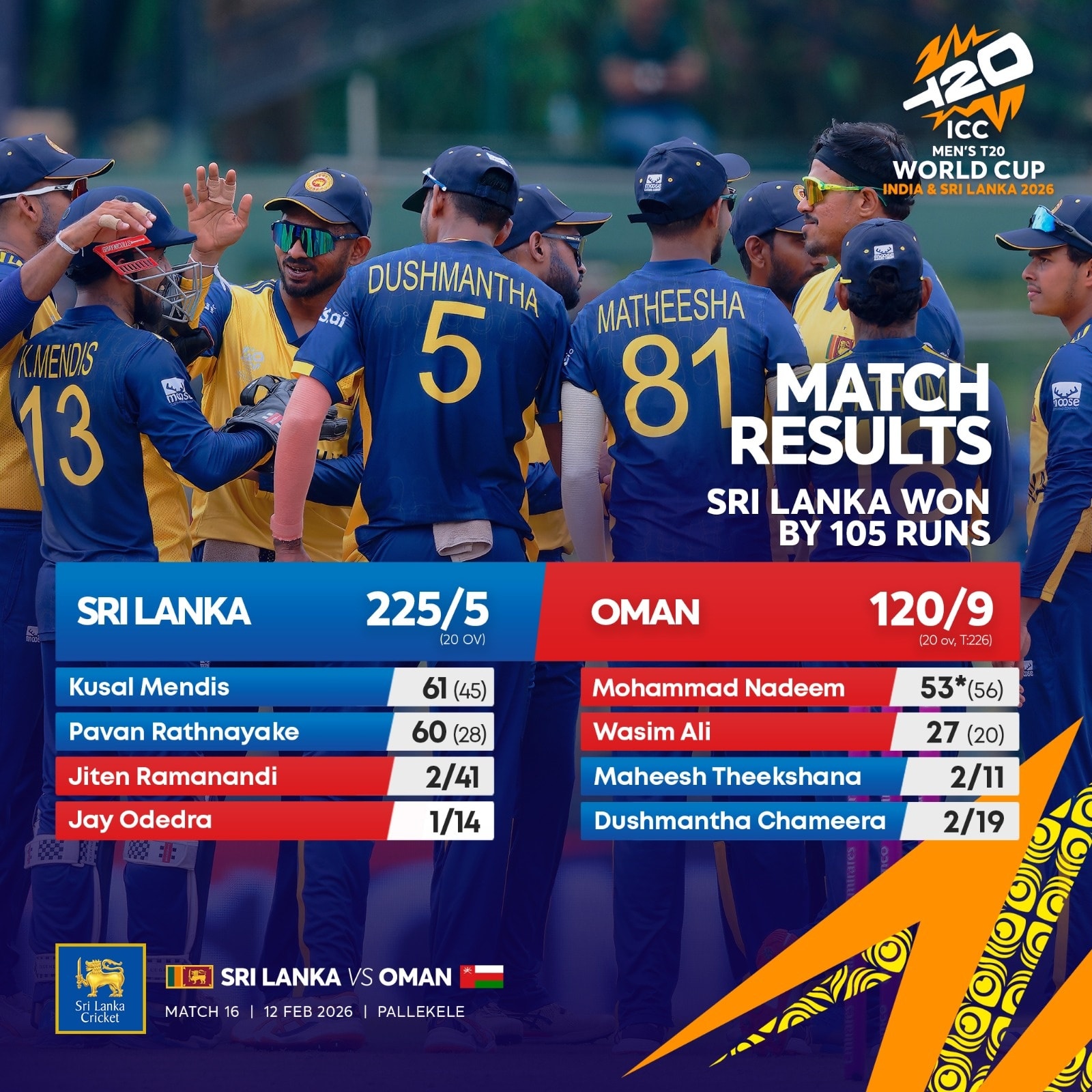 ஓமான் அணிக்கு எதிரான ஆட்டத்தில் இலங்கை அணி 105 ஓட்டங்களால் வெற்றி பெற்றுள்ளது.