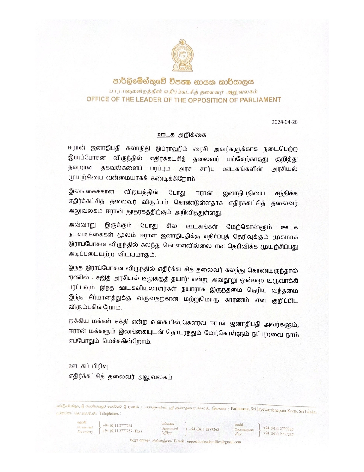 ஈரான் ஜனாதிபதி கலாநிதி இப்ராஹிம் ரைசி அவர்களுக்காக நடைபெற்ற இராப்போசன விருந்தில் எதிர்க்கட்சித் தலைவர் சஜித் பிரேமதாச பங்கேற்காதது குறித்து தவறான தகவல்களைப் பரப்பும் அரச சார்பு ஊடகங்களின் அரசியல் முயற்சியை வன்மையாகக் கண்டிக்கிறோம் – என்று எதிர்க்கட்சி தலைவர் அலுவலகம் விடுத்துள்ள ஊடக அறிக்கையில் தெரிவிக்கப்பட்டுள்ளது.