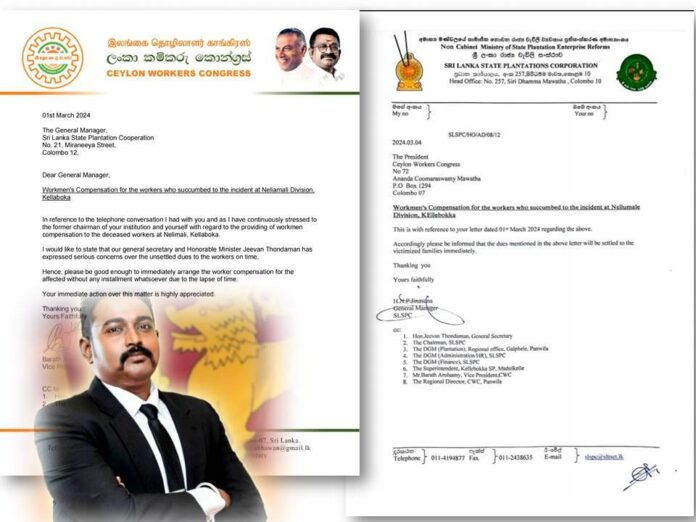 கண்டி, கலாபொக்க – நெல்லிமலை தோட்டத்தில் உயிரிழந்த இரு தொழிலாளர்களுக்குரிய இழப்பீட்டுத் தொகையை பெற்றுக்கொடுப்பதற்கு இலங்கைத் தொழிலாளர் காங்கிரஸ் நடவடிக்கை எடுத்துள்ளது.
