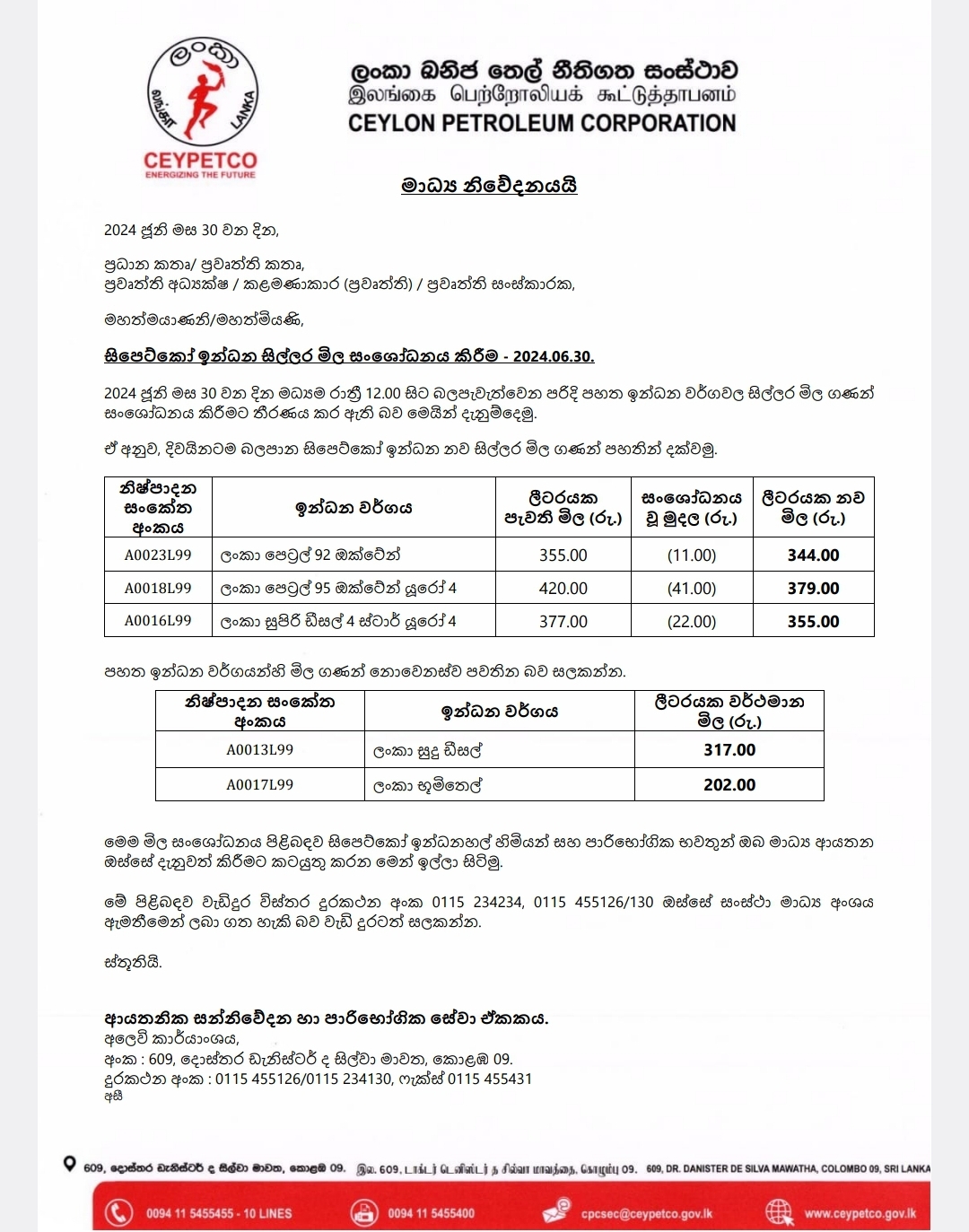 இன்று (30) நள்ளிரவு முதல் அமுலுக்கு வரும் வகையில் எரிபொருள் விலைகள் குறைக்கப்படவுள்ளதாக இலங்கை பெட்ரோலிய கூட்டுதாபனம் தெரிவித்துள்ளது.