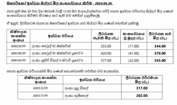 இன்று (30) நள்ளிரவு முதல் அமுலுக்கு வரும் வகையில் எரிபொருள் விலைகள் குறைக்கப்படவுள்ளதாக இலங்கை பெட்ரோலிய கூட்டுதாபனம் தெரிவித்துள்ளது.