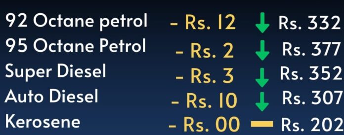 95 ரக பெட்ரோல் ஒரு லீற்றர் 02 ரூபாவினால் குறைக்கப்பட்டுள்ளது. ஒட்டோ டீசல் ஒரு லீற்றர் 10 ரூபாவினால் குறைக்கப்பட்டுள்ளது.