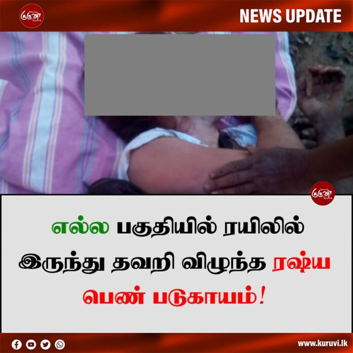 பதுளையில் இருந்து கொழும்பு நோக்கி சென்று கொண்டிருந்த புகையிரதத்தில் இருந்து கீழே விழுந்தது ரஷ்ய நாட்டு பெண்ணொருவர் படுகாயம் அடைந்துள்ளார் என எல்ல பொலிஸார் தெரிவித்தனர். இன்று முற்பகல் வேளையிலேயே இவ்விபத்து இடம்பெற்றுள்ளது.