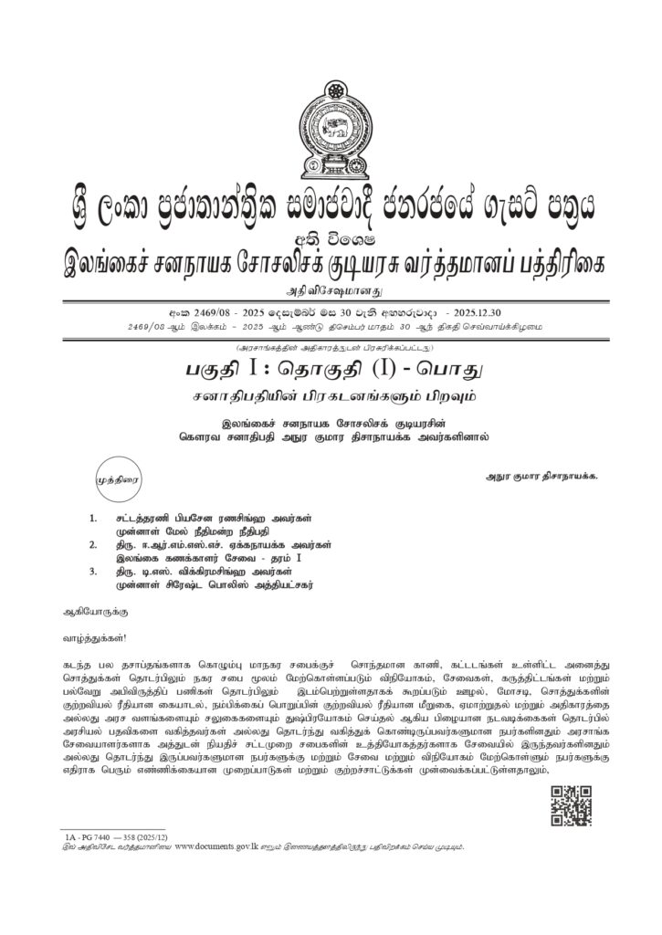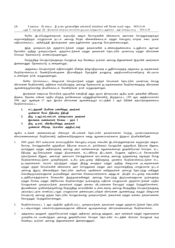 2010 முதல் 2025 வரையான காலப்பகுதியில் இடம்பெற்ற ஊழல், மோசடிகள் தொடர்பிலேயே இவ்வாறு விசாரணை நடத்தி, அறிக்கை பெறுவதற்காக மூவரடங்கிய குழு அமைக்கப்பட்டுள்ளது.