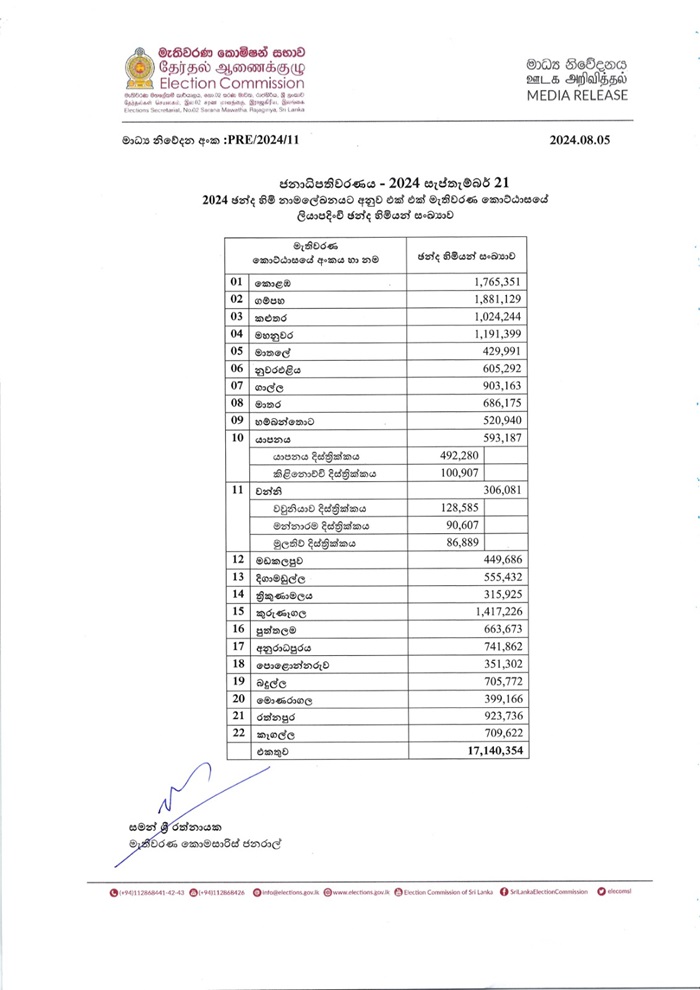 மாவட்ட ரீதியிலான வாக்காளர்களின் எண்ணிக்கை வருமாறு,