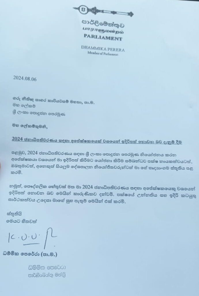 இது தொடர்பில் ஸ்ரீலங்கா பொதுஜன பெரமுன கட்சிக்கு அவர் இன்று எழுத்துமூலம் அறிவித்துள்ளார்.