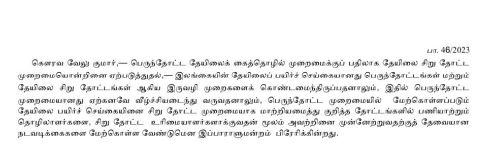 பெருந்தோட்ட தேயிலைக் கைத்தொழில் முறைமைக்குப் பதிலாக தேயிலை சிறு தோட்ட முறைமையொன்றினை ஏற்படுத்துமாறுகோரும் தனிநபர் பிரேரணைமீது நாடாளுமன்றத்தில் நாளை (12) விவாதம் நடத்தப்படவுள்ளது.
