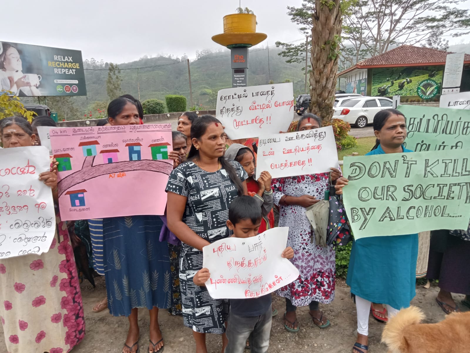 மலையக வளர்ச்சியை மண்ணில் புதைக்காதே, லாபம் தேடும்; முதலாளிகள், மதுவால் பாடசாலை சமூகத்தை அழிக்காதே போன்ற வாசகங்கள் எழுதிய சுலோக அட்டைகளை காட்சிப்படுத்திய வண்ணம் ஆர்ப்பாட்டத்தில் ஈடுப்பட்டனர்.