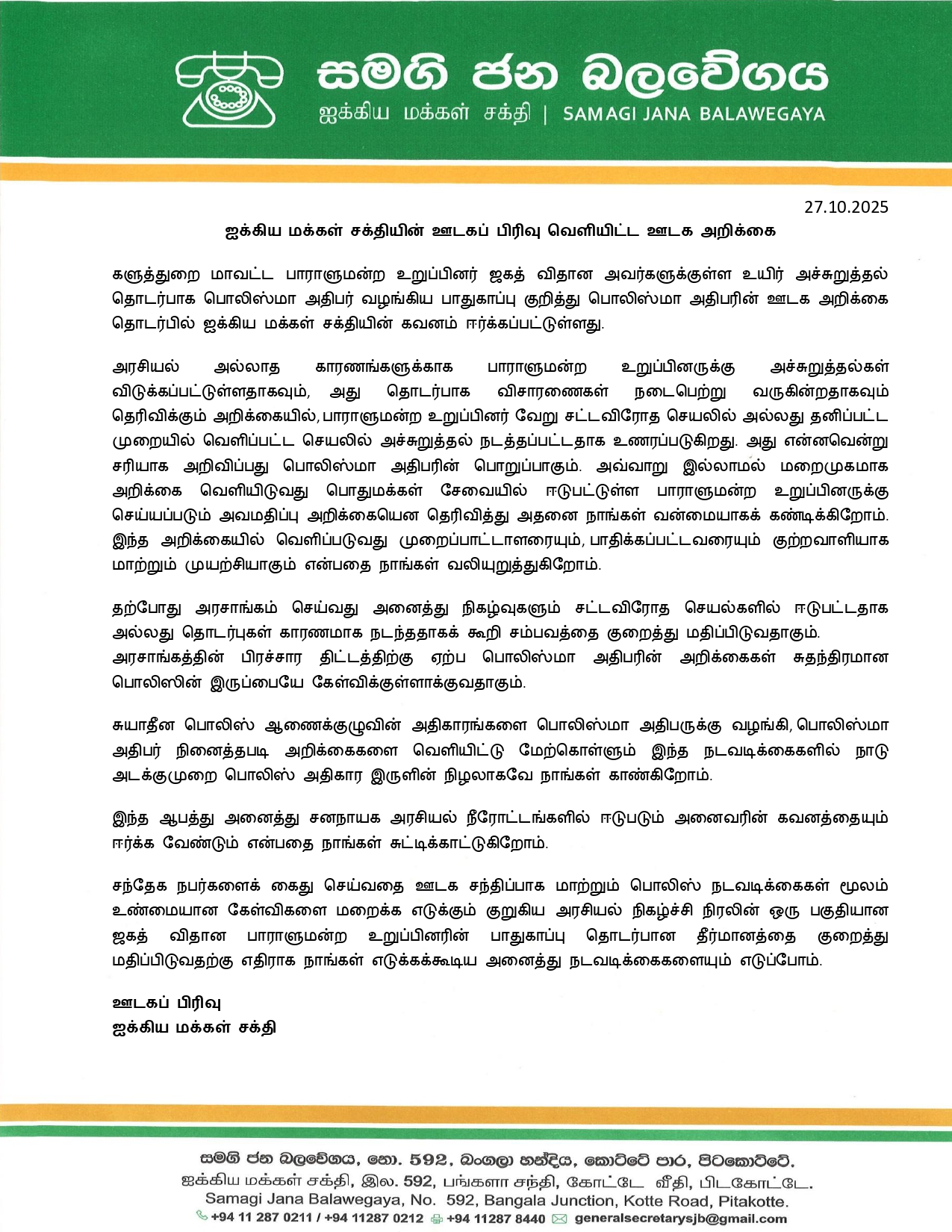 சந்தேக நபர்களைக் கைது செய்வதை ஊடக சந்திப்பாக மாற்றும் பொலிஸ் நடவடிக்கைகள் மூலம் உண்மையான கேள்விகளை மறைக்க எடுக்கும் குறுகிய அரசியல் நிகழ்ச்சி நிரலின் ஒரு பகுதியான ஜகத் விதான நாடாளுமன்ற உறுப்பினரின் பாதுகாப்பு தொடர்பான தீர்மானத்தை குறைத்து மதிப்பிடுவதற்கு எதிராக நாங்கள் எடுக்கக்கூடிய அனைத்து நடவடிக்கைகளையும் எடுப்போம்.” – என்றுள்ளது.