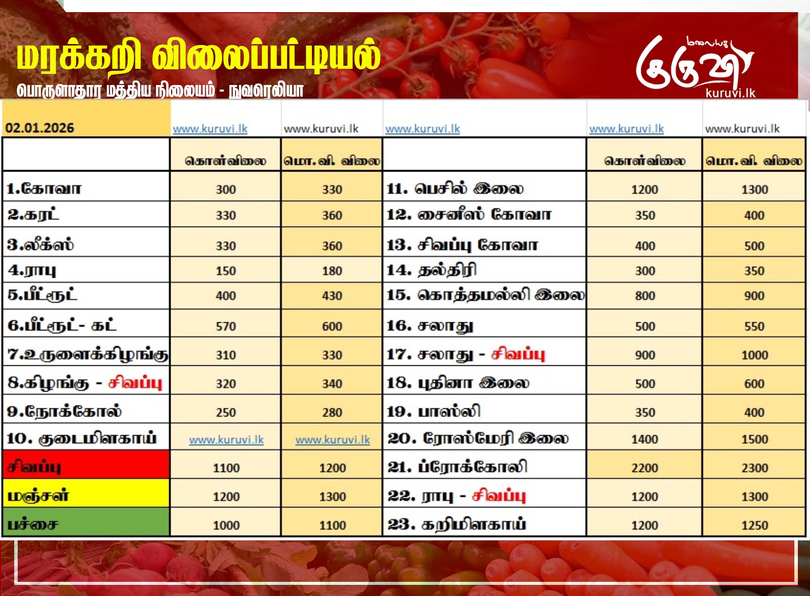 மரக்கறி விலைப்பட்டியல் (02.01.2026)