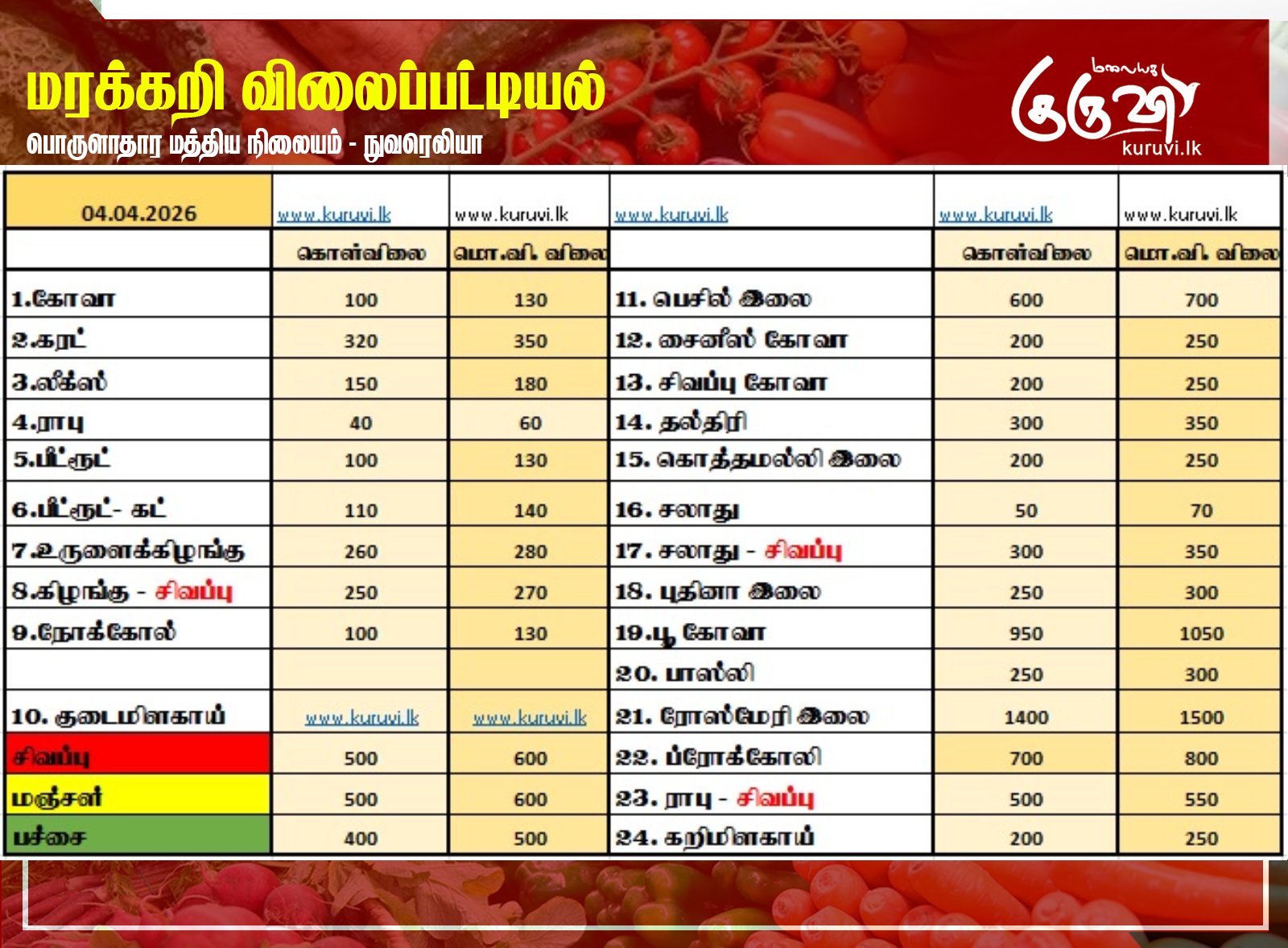 Homeஉள்நாடு உள்நாடுசெய்திவணிகம் மரக்கறி விலைப்பட்டியல் (04.04.2026) April 4, 2026 நுவரெலியா பொருளாதார மத்திய நிலையத்தால் இன்று (04) வெளியிடப்பட்டுள்ள மரக்கறி வகைகளின் (ஒரு கிலோ) விலை பட்டியல்… Share FacebookTwitterPinterestWhatsAppTelegramViber Related Articles உலகம் சுட்டுவீழ்த்தப்பட்ட அமெரிக்க போர் விமானங்கள்: ஈரானில் கொண்டாட்டம்! உலகம் ராஜினாமா செய்யுமாறு அமெரிக்க ராணுவ தளபதிக்கு உத்தரவு! உள்நாடு 2ஆவது போட்டியிலும் மண்கவ்வியது சி.எஸ்.கே.! Latest Articles உலகம் சுட்டுவீழ்த்தப்பட்ட அமெரிக்க போர் விமானங்கள்: ஈரானில் கொண்டாட்டம்! உலகம் ராஜினாமா செய்யுமாறு அமெரிக்க ராணுவ தளபதிக்கு உத்தரவு! உள்நாடு 2ஆவது போட்டியிலும் மண்கவ்வியது சி.எஸ்.கே.! உலகம் பதிலடி! வளைகுடாவில் 8 பாலங்களை தகர்க்க ஈரான் திட்டம்!! உலகம் ஈரானின் ஏவுகணை வலிமை இன்னும் அழியவில்லை: அமெரிக்க உளவு பிரிவு Load more