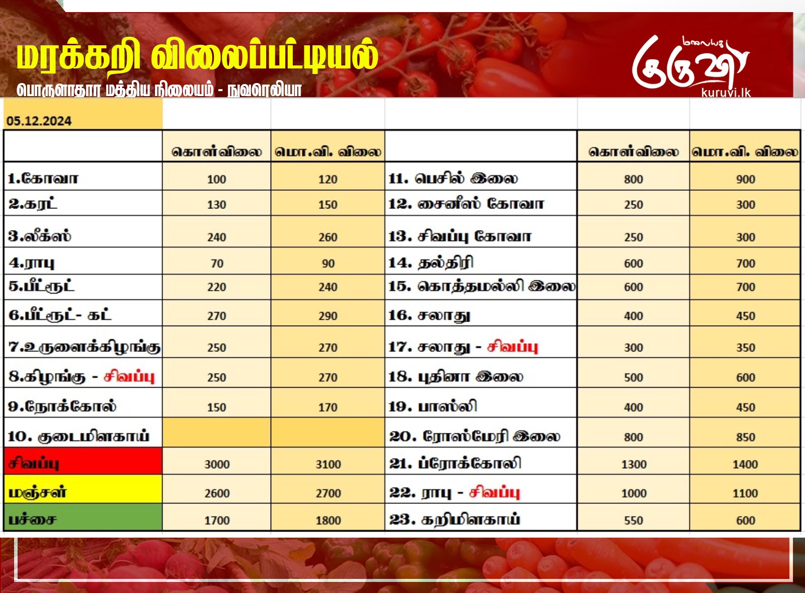 Homeஉள்நாடு உள்நாடுசெய்தி மரக்கறி விலைப்பட்டியல் (05.12.2024) December 5, 2024 நுவரெலியா பொருளாதார மத்திய நிலையத்தால் இன்று (05) வெளியிடப்பட்டுள்ள மரக்கறி வகைகளின் (ஒரு கிலோ) விலை பட்டியல்… Share FacebookTwitterPinterestWhatsAppTelegramViber தேயிலை தொழிற்சாலைக்குள் அதிரடியாக புகுந்த அமைச்சர் ஜீவன்!02:50 ரூ. 1,700 இல்லையேல் தக்க பாடம் புகட்டுவோம்! தோட்ட தொழிலாளர்கள் கொந்தளிப்பு03:37 வெடுக்குநாறி மலை சிவராத்திரி பூஜையை, இனவாதம் ரீதியில் விமர்சித்த விமல்!04:13 தொல்பொருள் திணைக்கள அதிகாரிகளின் அடாவடி! வவுனியாவில் அட்டகாசம்! வெளுத்து வாங்கிய சாணக்கியன்07:58 மதச் சுதந்திரம் வடக்கிற்கும் தெற்கிற்கும் சமமாக இருக்க வேண்டும்! வெடுக்குநாறி மலைச் சம்பவம்.!07:54 இப்படி ஒரு பண்டிகை இலங்கையில இருக்கா🤭😳😲#news #srilanka #vairalvideo #vairal #malaiyagakuruvi #lka02:55 மலையக மக்கள் இன்னும் ஏமார்ந்து கொண்டிருக்கின்றனர். I தேசிய மக்கள் சக்தியின் தெனியா மாநாடு I NPP11:43 இலங்கை வந்த இளவரசிக்கு ஜனாதிபதி மாளிகையில் வரவேற்பு02:16 நான் மருத்துவராக வேண்டும்! ஊடகங்களிடம் மனம் திறந்த கில்மிசா..03:39 முத்து சப்பரத்தில் இசைக்குயில்....! மேளதாளத்துடன் கோலாகல வரவேற்பு..!!03:05 Related Articles உள்நாடு இன்றைய (16.03.2026) நாணய மாற்று விகிதம் உலகம் துபாய் விமான நிலையம் அருகே ட்ரோன் தாக்குதல்: விமானப் போக்குவரத்து நிறுத்தம்! உள்நாடு மனோ, அநுர தொலைபேசி உரையாடல்: அடுத்த வாரம் நேரடி சந்திப்பு! Latest Articles உள்நாடு இன்றைய (16.03.2026) நாணய மாற்று விகிதம் உலகம் துபாய் விமான நிலையம் அருகே ட்ரோன் தாக்குதல்: விமானப் போக்குவரத்து நிறுத்தம்! உள்நாடு மனோ, அநுர தொலைபேசி உரையாடல்: அடுத்த வாரம் நேரடி சந்திப்பு! உலகம் போர்க்கப்பல்: ட்ரம்பின் கோரிக்கையை நிராகரித்த முக்கிய நாடுகள்! சினிமா “நான் தயாரித்த படங்கள் அனைத்தும் நஷ்டமே” – விஜய் சேதுபதி Load more