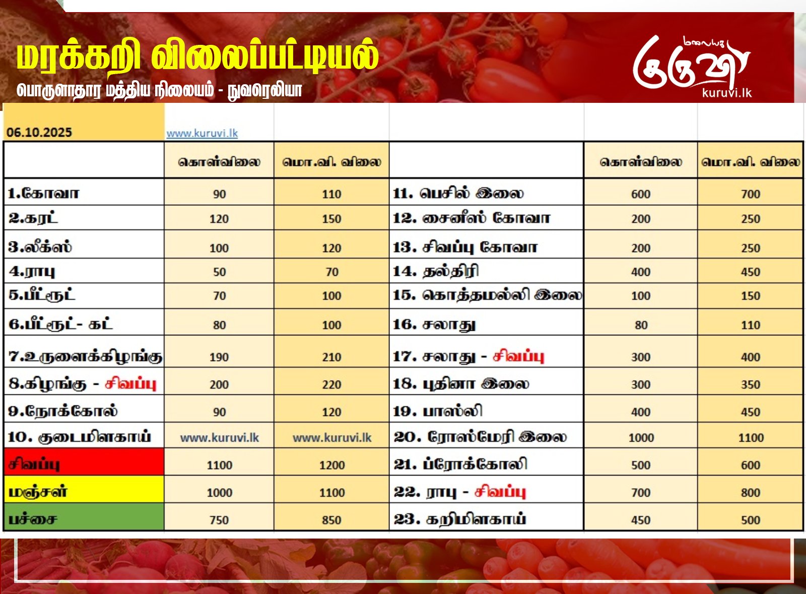 Homeஉள்நாடு உள்நாடுசெய்திவணிகம் மரக்கறி விலைப்பட்டியல் (06.10.2025) October 6, 2025 மரக்கறி விலைப்பட்டியல் (06.10.2025) நுவரெலியா பொருளாதார மத்திய நிலையத்தால் இன்று (06) வெளியிடப்பட்டுள்ள மரக்கறி வகைகளின் (ஒரு கிலோ) விலை பட்டியல்… Share FacebookTwitterPinterestWhatsAppTelegramViber Related Articles உலகம் சுற்றுச்சூழல் ஆர்வலர் துன்புறுத்தல்: இஸ்ரேல் மறுப்பு! உள்நாடு தமிழருக்கு சர்வதேச நீதி வேண்டும்: ஜெனிவாவில் சிறீதரன் எடுத்துரைப்பு! உலகம் சிட்னியில் 100 தடவைகள் துப்பாக்கிச்சூடு: பயங்கரவாதத் தாக்குதலா? Latest Articles உலகம் சுற்றுச்சூழல் ஆர்வலர் துன்புறுத்தல்: இஸ்ரேல் மறுப்பு! உள்நாடு தமிழருக்கு சர்வதேச நீதி வேண்டும்: ஜெனிவாவில் சிறீதரன் எடுத்துரைப்பு! உலகம் சிட்னியில் 100 தடவைகள் துப்பாக்கிச்சூடு: பயங்கரவாதத் தாக்குதலா? உள்நாடு மக்களுடனான என் இதயபூர்வமான பிணைப்பை உடைக்க முயன்றால் அது மேலும் வலுவடையும்! உள்நாடு கோர விபத்து: மூவர் பலி! Load more