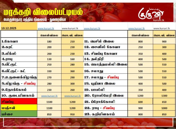 Homeஉள்நாடு உள்நாடுசெய்திவணிகம் மரக்கறி விலைப்பட்டியல் (13.12.2025) December 13, 2025 நுவரெலியா பொருளாதார மத்திய நிலையத்தால் இன்று (13) வெளியிடப்பட்டுள்ள மரக்கறி வகைகளின் (ஒரு கிலோ) விலை பட்டியல்… Share FacebookTwitterPinterestWhatsAppTelegramViber Related Articles உலகம் அமெரிக்க பல்கலையில் துப்பாக்கிச்சூடு: 2 பேர் பலி: 8 பேர் படுகாயம்! உள்நாடு சுதந்திரக் கட்சியில் மைத்திரி மீண்டும் சங்கமம்? சினிமா மரத்தில் ரஜினி படம்: புதுச்சேரி ஓவியரின் முயற்சியை ரசித்த மக்கள் Latest Articles உலகம் அமெரிக்க பல்கலையில் துப்பாக்கிச்சூடு: 2 பேர் பலி: 8 பேர் படுகாயம்! உள்நாடு சுதந்திரக் கட்சியில் மைத்திரி மீண்டும் சங்கமம்? சினிமா மரத்தில் ரஜினி படம்: புதுச்சேரி ஓவியரின் முயற்சியை ரசித்த மக்கள் உள்நாடு என்.பி.பி. ஆட்சியில் வெளிநாட்டு உதவிகள் முறைகேடாக பயன்படுத்தப்படாது: தேரர் நம்பிக்கை உள்நாடு மலையகத் தமிழ் உறவுகளுக்கு வடக்கு – கிழக்கு துணை நிற்கும் Load more