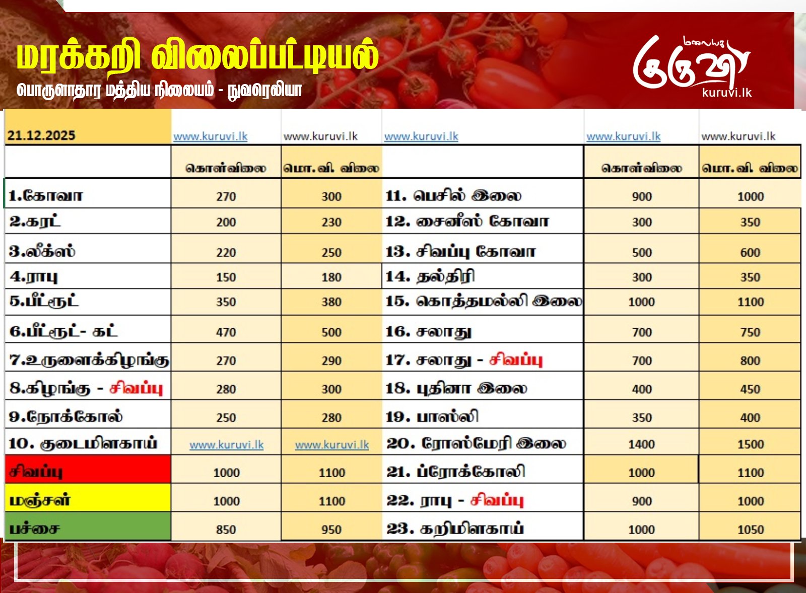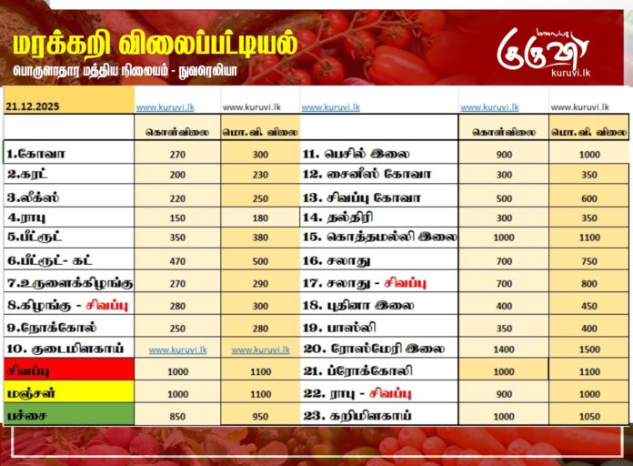 Homeஉள்நாடு உள்நாடுசெய்திவணிகம் மரக்கறி விலைப்பட்டியல் (201.12.2025) December 21, 2025 மரக்கறி விலைப்பட்டியல் (21.12.2025) நுவரெலியா பொருளாதார மத்திய நிலையத்தால் இன்று (21) வெளியிடப்பட்டுள்ள மரக்கறி வகைகளின் (ஒரு கிலோ) விலை பட்டியல்… Share FacebookTwitterPinterestWhatsAppTelegramViber தேயிலை தொழிற்சாலைக்குள் அதிரடியாக புகுந்த அமைச்சர் ஜீவன்!02:50 ரூ. 1,700 இல்லையேல் தக்க பாடம் புகட்டுவோம்! தோட்ட தொழிலாளர்கள் கொந்தளிப்பு03:37 வெடுக்குநாறி மலை சிவராத்திரி பூஜையை, இனவாதம் ரீதியில் விமர்சித்த விமல்!04:13 தொல்பொருள் திணைக்கள அதிகாரிகளின் அடாவடி! வவுனியாவில் அட்டகாசம்! வெளுத்து வாங்கிய சாணக்கியன்07:58 மதச் சுதந்திரம் வடக்கிற்கும் தெற்கிற்கும் சமமாக இருக்க வேண்டும்! வெடுக்குநாறி மலைச் சம்பவம்.!07:54 இப்படி ஒரு பண்டிகை இலங்கையில இருக்கா🤭😳😲#news #srilanka #vairalvideo #vairal #malaiyagakuruvi #lka02:55 மலையக மக்கள் இன்னும் ஏமார்ந்து கொண்டிருக்கின்றனர். I தேசிய மக்கள் சக்தியின் தெனியா மாநாடு I NPP11:43 இலங்கை வந்த இளவரசிக்கு ஜனாதிபதி மாளிகையில் வரவேற்பு02:16 நான் மருத்துவராக வேண்டும்! ஊடகங்களிடம் மனம் திறந்த கில்மிசா..03:39 முத்து சப்பரத்தில் இசைக்குயில்....! மேளதாளத்துடன் கோலாகல வரவேற்பு..!!03:05 Related Articles உள்நாடு அரசியல் நாடகம் அரங்கேற்றாமல் நம்பிக்கையில்லாப் பிரேரணையை முன்வையுங்கள்! உள்நாடு 15 வயதுக்குட்பட்டோர் சமூக வலைதளங்கள் பயன்படுத்த தடை – பிரான்ஸ் நாடாளுமன்றம் ஒப்புதல் உள்நாடு ரணிலின் செயலாளரான சமன் விளக்கமறியலில்! Latest Articles உள்நாடு அரசியல் நாடகம் அரங்கேற்றாமல் நம்பிக்கையில்லாப் பிரேரணையை முன்வையுங்கள்! உள்நாடு 15 வயதுக்குட்பட்டோர் சமூக வலைதளங்கள் பயன்படுத்த தடை – பிரான்ஸ் நாடாளுமன்றம் ஒப்புதல் உள்நாடு ரணிலின் செயலாளரான சமன் விளக்கமறியலில்! உள்நாடு உயர் நிதி ஒழுக்கத்தை பேணும் அரசாங்கம்: IMF பாராட்டு! உள்நாடு 25 நாட்களுக்குள் 2 லட்சத்துக்கு மேற்பட்ட சுற்றுலாப் பயணிகள் இலங்கை வருகை! Load more