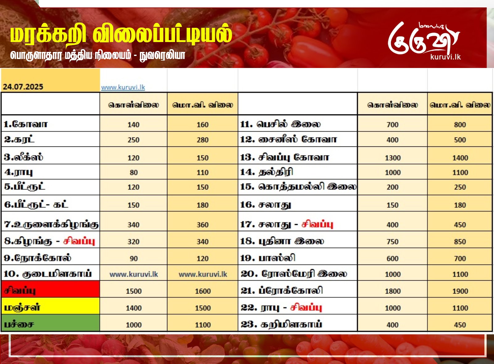 Homeஉள்நாடு உள்நாடுசெய்தி மரக்கறி விலைப்பட்டியல் (24.07.2025) July 24, 2025 நுவரெலியா பொருளாதார மத்திய நிலையத்தால் இன்று (24) வெளியிடப்பட்டுள்ள மரக்கறி வகைகளின் (ஒரு கிலோ) விலை பட்டியல்… Share FacebookTwitterPinterestWhatsAppTelegramViber தேயிலை தொழிற்சாலைக்குள் அதிரடியாக புகுந்த அமைச்சர் ஜீவன்!02:50 ரூ. 1,700 இல்லையேல் தக்க பாடம் புகட்டுவோம்! தோட்ட தொழிலாளர்கள் கொந்தளிப்பு03:37 வெடுக்குநாறி மலை சிவராத்திரி பூஜையை, இனவாதம் ரீதியில் விமர்சித்த விமல்!04:13 தொல்பொருள் திணைக்கள அதிகாரிகளின் அடாவடி! வவுனியாவில் அட்டகாசம்! வெளுத்து வாங்கிய சாணக்கியன்07:58 மதச் சுதந்திரம் வடக்கிற்கும் தெற்கிற்கும் சமமாக இருக்க வேண்டும்! வெடுக்குநாறி மலைச் சம்பவம்.!07:54 இப்படி ஒரு பண்டிகை இலங்கையில இருக்கா🤭😳😲#news #srilanka #vairalvideo #vairal #malaiyagakuruvi #lka02:55 மலையக மக்கள் இன்னும் ஏமார்ந்து கொண்டிருக்கின்றனர். I தேசிய மக்கள் சக்தியின் தெனியா மாநாடு I NPP11:43 இலங்கை வந்த இளவரசிக்கு ஜனாதிபதி மாளிகையில் வரவேற்பு02:16 நான் மருத்துவராக வேண்டும்! ஊடகங்களிடம் மனம் திறந்த கில்மிசா..03:39 முத்து சப்பரத்தில் இசைக்குயில்....! மேளதாளத்துடன் கோலாகல வரவேற்பு..!!03:05 Related Articles உள்நாடு மின் கட்டண அதிகரிப்புக்கு அனுமதி! உலகம் லெபனானில் ராணுவ நடவடிக்கை: 6 இஸ்ரேல் படையினர் காயம்! உள்நாடு “தமிழரசுக் கட்சியில் சேரும் தகுதி முன்னாள் போராளிகளுக்கே அதிகம்” Latest Articles உள்நாடு மின் கட்டண அதிகரிப்புக்கு அனுமதி! உலகம் லெபனானில் ராணுவ நடவடிக்கை: 6 இஸ்ரேல் படையினர் காயம்! உள்நாடு “தமிழரசுக் கட்சியில் சேரும் தகுதி முன்னாள் போராளிகளுக்கே அதிகம்” உள்நாடு இன்றைய (30.03.2026) நாணய மாற்று விகிதம் செய்தி ஈரான் போரில் 3 பில்லியன் டாலர் மதிப்புள்ள அமெரிக்க ராணுவ சொத்துகள் சேதம்! Load more