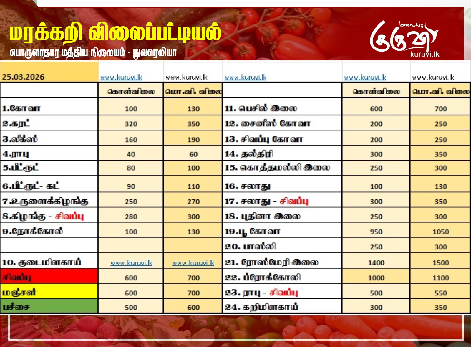 Homeஉள்நாடு உள்நாடுசெய்திவணிகம் மரக்கறி விலைப்பட்டியல் (25.03.2026) March 25, 2026 நுவரெலியா பொருளாதார மத்திய நிலையத்தால் இன்று (25) வெளியிடப்பட்டுள்ள மரக்கறி வகைகளின் (ஒரு கிலோ) விலை பட்டியல்… Share FacebookTwitterPinterestWhatsAppTelegramViber Related Articles உள்நாடு கைப்பற்றப்பட்ட போதைப்பொருட்களை விரைவாக அழிக்க புதிய பொறிமுறை உலகம் போரில் வென்றுவிட்டோம்: ட்ரம்ப் கொக்கரிப்பு! உள்நாடு பிரதமர் மோடி, ஜனாதிபதி அநுர பேச்சு! Latest Articles உள்நாடு கைப்பற்றப்பட்ட போதைப்பொருட்களை விரைவாக அழிக்க புதிய பொறிமுறை உலகம் போரில் வென்றுவிட்டோம்: ட்ரம்ப் கொக்கரிப்பு! உள்நாடு பிரதமர் மோடி, ஜனாதிபதி அநுர பேச்சு! Featured வடக்கு ஆளுநரைச் சந்தித்தார் ஐ.நா. பிரதிநிதி உள்நாடு மலையக தமிழர்கள் குறித்து அவதூறு கருத்து: அர்ச்சுனாவுக்கு எதிராக சி.ஐ.டியில் முறைப்பாடு! Load more