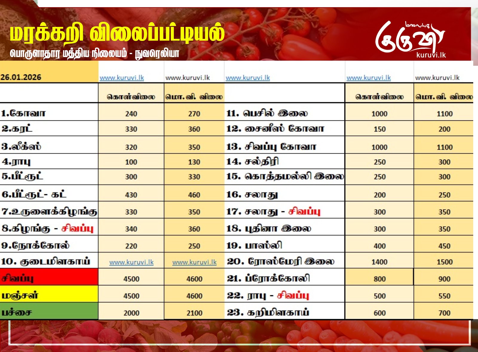 Homeஉள்நாடு உள்நாடுசெய்திவணிகம் மரக்கறி விலைப்பட்டியல் (26.01.2026) January 26, 2026 மரக்கறி விலைப்பட்டியல் (26.01.2026) நுவரெலியா பொருளாதார மத்திய நிலையத்தால் இன்று (26) வெளியிடப்பட்டுள்ள மரக்கறி வகைகளின் (ஒரு கிலோ) விலை பட்டியல்… Share FacebookTwitterPinterestWhatsAppTelegramViber Related Articles உள்நாடு கொழும்பு துறைமுகத்தில் இந்திய கடலோரக் காவல்படை கப்பல்கள் உள்நாடு தமிழரசுக் கட்சியின் நாடாளுமன்ற குழு தலைவர் பதவியில் இருந்து ஸ்ரீதரனை நீக்க முடிவு! உள்நாடு கிவுல்ஓயா திட்டம் மக்களுக்கானது:அமைச்சர் விளக்கம்! Latest Articles உள்நாடு கொழும்பு துறைமுகத்தில் இந்திய கடலோரக் காவல்படை கப்பல்கள் உள்நாடு தமிழரசுக் கட்சியின் நாடாளுமன்ற குழு தலைவர் பதவியில் இருந்து ஸ்ரீதரனை நீக்க முடிவு! உள்நாடு கிவுல்ஓயா திட்டம் மக்களுக்கானது:அமைச்சர் விளக்கம்! உள்நாடு பாதுகாப்பு செயலரை அமெரிக்க தூதுவராக நிமித்தது ஆஸ்திரேலியா! உள்நாடு 78 அரசியல் கட்சிகளின் பதிவு விண்ணப்பங்கள் நிராகரிப்பு! Load more