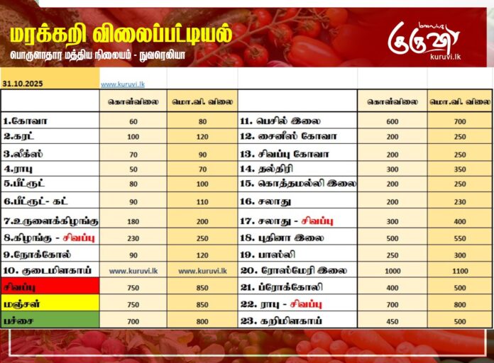 Homeஉள்நாடு உள்நாடுசெய்திவணிகம் மரக்கறி விலைப்பட்டியல் (31.10.2025) October 31, 2025 நுவரெலியா பொருளாதார மத்திய நிலையத்தால் இன்று (31) வெளியிடப்பட்டுள்ள மரக்கறி வகைகளின் (ஒரு கிலோ) விலை பட்டியல்… Share FacebookTwitterPinterestWhatsAppTelegramViber Related Articles உலகம் பப்புவா நியூ கினியாவில் மண்சரிவு: 21 பேர் பலி! உள்நாடு 7 ஆம் திகதி பட்ஜட் முன்வைப்பு: சஜித் அணி கூறுவது என்ன? உள்நாடு மரக்கறி விலைப்பட்டியல் (01.11.2025) Latest Articles உலகம் பப்புவா நியூ கினியாவில் மண்சரிவு: 21 பேர் பலி! உள்நாடு 7 ஆம் திகதி பட்ஜட் முன்வைப்பு: சஜித் அணி கூறுவது என்ன? உள்நாடு மரக்கறி விலைப்பட்டியல் (01.11.2025) உள்நாடு கொள்கை இல்லாத எதிரணியுடன் கூட்டு கிடையாது: 21 ஆம் திகதி போராட்டத்துக்கு மக்கள் போராட்ட முன்னணி ஆதரவு வழங்காது! உள்நாடு ஹொரோயின் போதைப்பொருளுடன் பெண் உட்பட ஐவர் யாழில் கைது! Load more