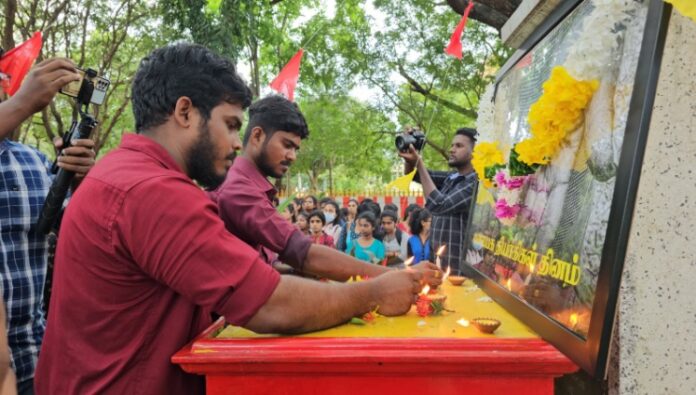 யாழ்ப்பாண பல்கலைக்கழக மாணவர் ஒன்றியத்தின் ஏற்பாட்டில் நடைபெற்ற நினைவேந்தல் நிகழ்வில் பல்கலைக்கழக மாணவர்கள் மற்றும் பேராசிரியர்கள் கலந்துகொண்டனர்.