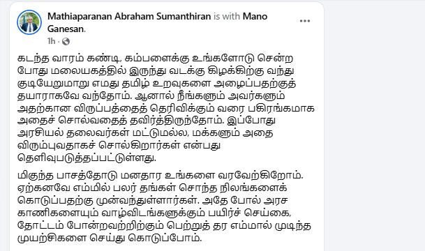 கடந்த வாரம் கண்டி, கம்பளைக்கு உங்களோடு சென்ற போது மலையகத்தில் இருந்து வடக்கு கிழக்கிற்கு வந்து குடியேறுமாறு எமது தமிழ் உறவுகளை அழைப்பதற்குத் தயாராகவே வந்தோம். ஆனால் நீங்களும் அவர்களும் அதற்கான விருப்பத்தைத் தெரிவிக்கும் வரை பகிரங்கமாக அதைச் சொல்வதைத் தவிர்த்திருந்தோம்.