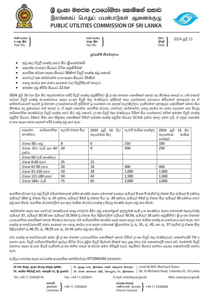 வீட்டுப் பாவனை மின் கட்டணம் 27 சதவீதத்தினாலும், மத ஸ்தலங்களுக்கான மின் கட்டணம் 30 சதவீதத்தினாலும், விருந்தகங்கள் மற்றும் கைத்தொழிற்துறைக்கான கட்டணம் 25 சதவீதத்தினாலும் குறைவடைகின்றது.