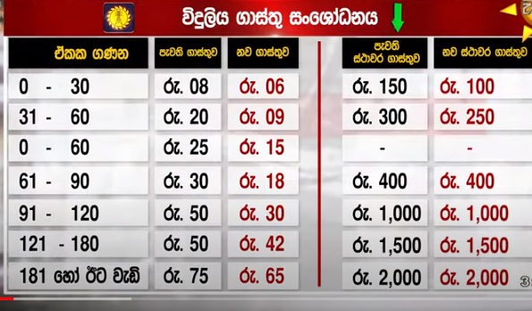121 முதல் 180 வரையிலான அலகு ஒன்றின் கட்டணம் 8 ரூபாவினால் குறைக்கப்பட்டுள்ளது. 50 ரூபாவாக இருந்த கட்டணம் இனி 42 ரூபா என்ற அடிப்படையிலேயே அறவிடப்படும்.