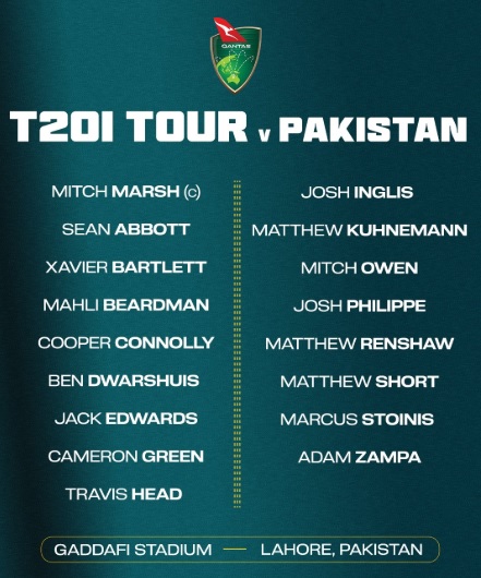 பாகிஸ்தான் அணியுடன் நடைபெறவுள்ள மூன்று டி- 20 போட்டிகளுக்கான ஆஸ்திரேலிய அணி விபரம் அறிவிக்கப்பட்டுள்ளது.