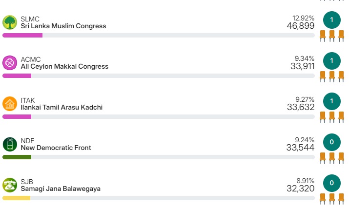 அடுத்ததாக ஸ்ரீலங்கா முஸ்லிம் காங்கிரஸ் 46 ஆயிரத்து 899 வாக்குகளைப் பெற்று ஓர் ஆசனத்தையும், அகில இலங்கை மக்கள் காங்கிரஸ் 33 ஆயிரத்து 911 வாக்குகளைப் பெற்று ஓர் ஆசனத்தையும், இலங்கைத்  தமிழரசுக் கட்சி 33 ஆயிரத்து 632 வாக்குகளைப் பெற்று ஓர் ஆசனத்தையும் பெற்றுள்ளன.