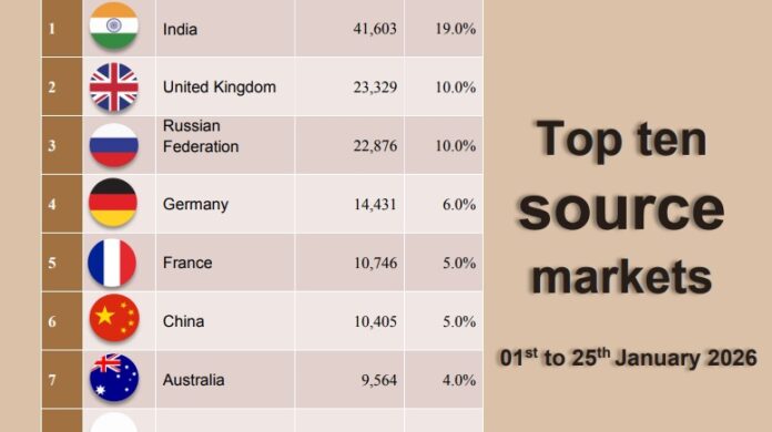 ஜனவரி 1 முதல் 25 வரை இந்தியாவில் இருந்து 41 ஆயிரத்து 603 பேரும், பிரிட்டனில் இருந்து 23 ஆயிரத்து 329 பேரும், ரஷ்யாவில் இருந்து 22 ஆயிரத்து 876 பேரும் இலங்கைக்கு சுற்றுலா வந்துள்ளனர்.