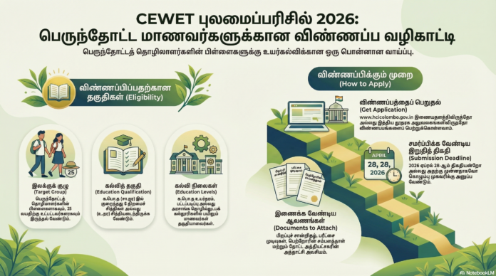 04. முறையாகப் பூர்த்தி செய்யப்பட்ட படிவங்கள் கௌரவ செயலாளர், இலங்கை பெருந்தோட்டத் தொழிலாளர் கல்வி நிதியம் (CEWET) மே/பா, இந்திய உயர் ஸ்தானிகராலயம், த.பெ.இலக்கம்-882, காலி வீதி, கொழும்பு-03 என்ற முகவரிக்கு 2026 ஏப்ரல் 28ஆம் திகதியன்றோ அல்லது அதற்கு முன்னதாகவோ கிடைக்கும் வகையில் அனுப்பப்படுதல் வேண்டும்.