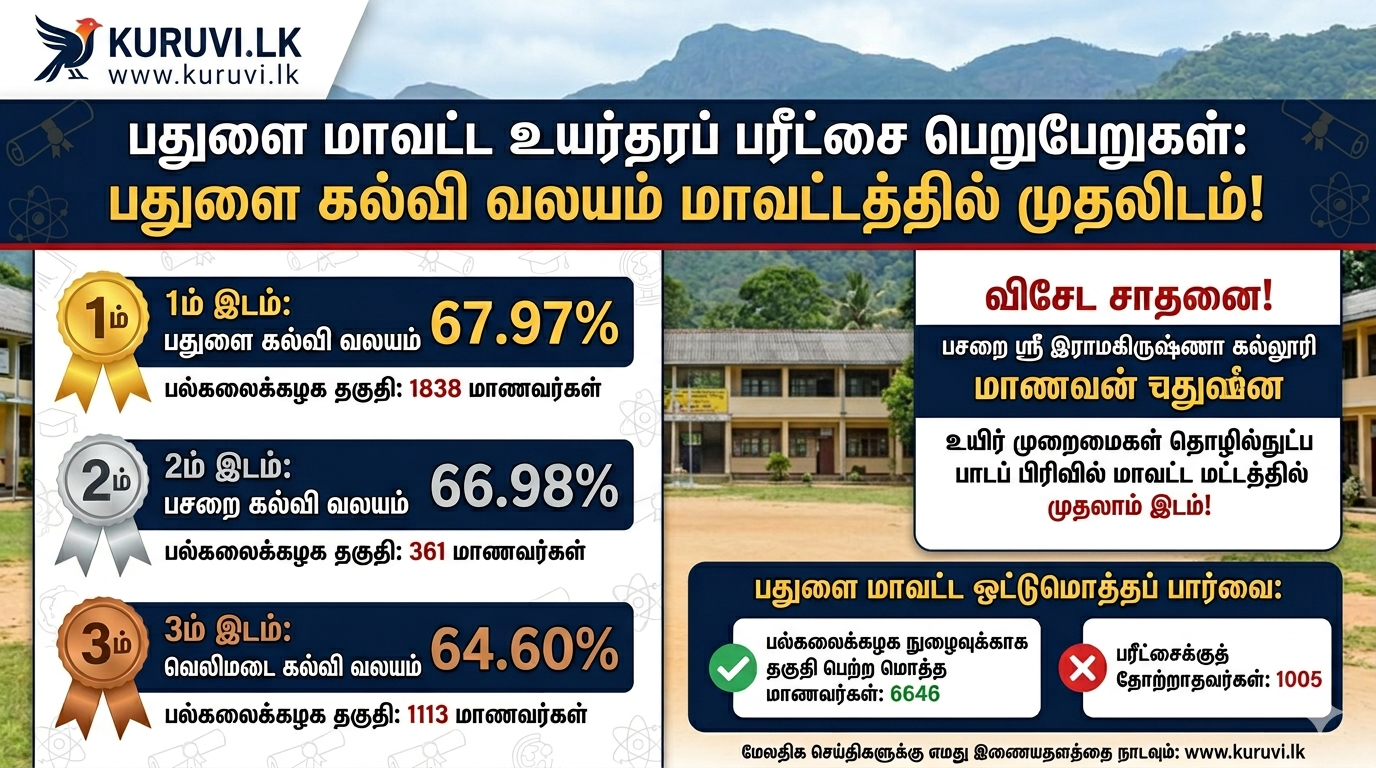 பதுளை மாவட்டத்தில் 10242 பாடசாலை பரீட்சார்த்திகள் பரீட்சைக்கு விண்ணப்பித்திருந்த நிலையில் அவர்களில் 6646 மாணவர்கள் பல்கலைகழகங்களில் உயர்கல்வி கற்பதற்காக விண்ணப்பிக்கத் தகுதி பெற்றுள்ளனர்.1005 மாணவர்கள் பரீட்சைக்குத் தோற்றவில்லை என்பது குறிப்பிடத்தக்கது.