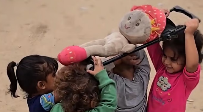 இஸ்ரேல் தாக்குதலால் கடுமையாக பாதிக்கப்பட்டுள்ள காசா நகரில் வாழும் மழலைகள் பொம்மைக்கு இறுதிச் சடங்கு செய்வதுபோல் விளையாடிய வீடியோ இப்போது உலகளவில் சமூக வலைதளங்களில் பரவி கவனம் பெற்றுள்ளது.
