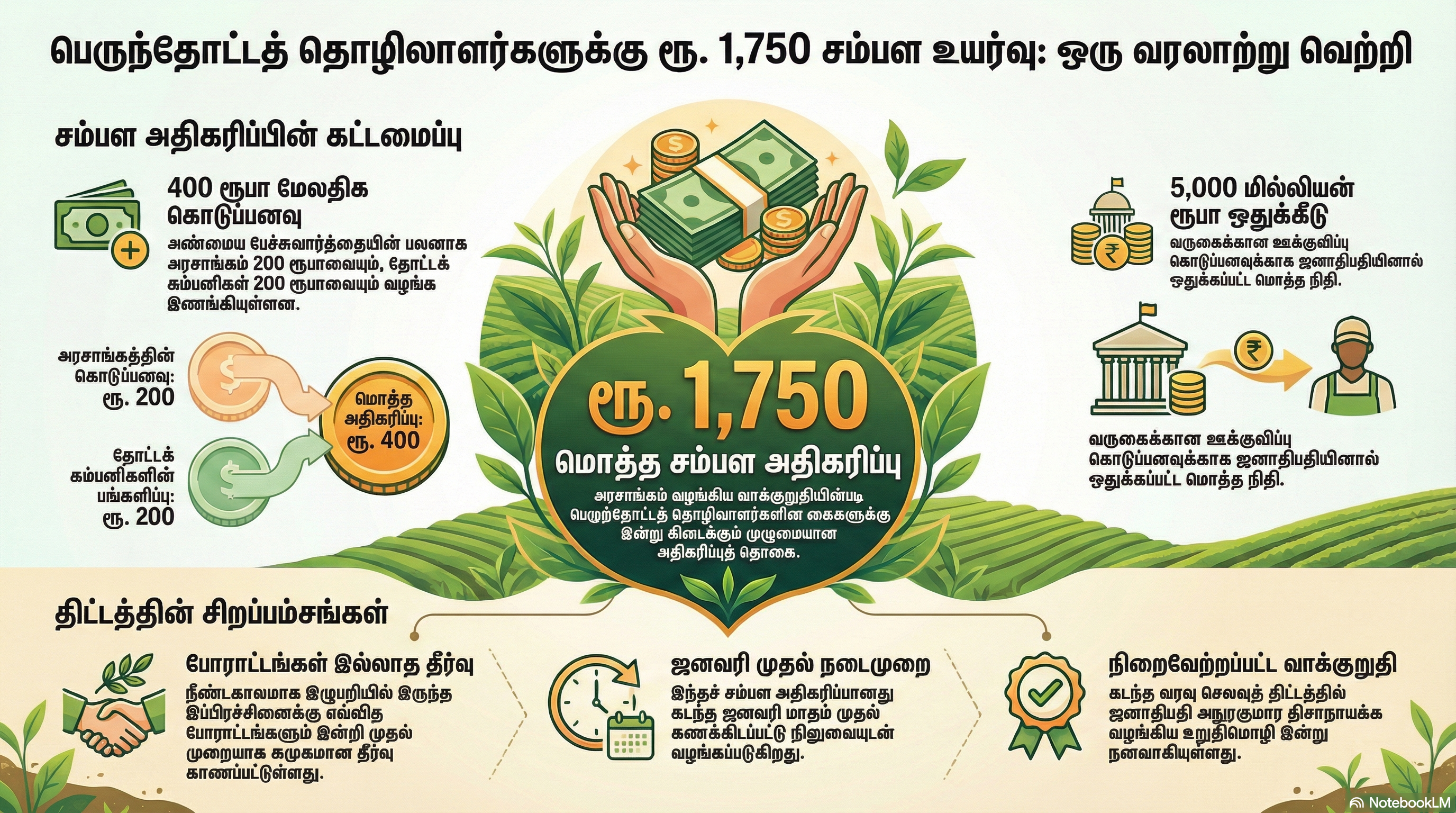அந்த வகையில் நீண்ட காலக் கனவாக இருந்த இந்த சம்பள அதிகரிப்பு பெரும் ஆறுதலளிப்பதாகத் பெருந்தோட்ட மக்கள் தெரிவிக்கின்றனர். எந்தவித போராட்டங்களும் இன்றி முதல் தடவையாகக் கிடைத்த சம்பள அதிகரிப்பு இதுவென அவர்கள் மகிழ்ச்சியுடன் தெரிவிக்கும் அதேவேளை, ஜனாதிபதி அநுரகுமார திசாநாயக்கவுக்கும் அவர் தலைமையிலான தேசிய மக்கள் சக்தி அரசாங்கத்துக்கும் தமது நன்றிகளைத் தெரிவிக்கின்றனர்.