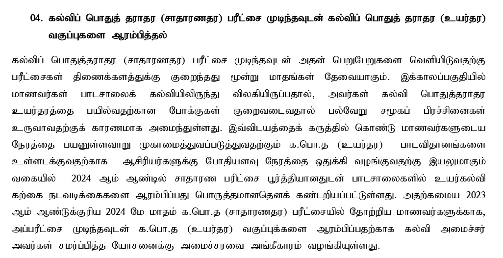 இந்த விடயத்தை கருத்தில் கொண்டு மாணவர்களின் காலத்தை வினைத்திறனாக முகாமைத்துவம் செய்வதற்கு மற்றும் கல்விப் பொதுத்தராதரப் பத்திர (உயர்தர) பாடத்திற்கான சிபாரிசுகளை உள்ளடக்குவதற்காக எனக்கு போதுமான காலம் வழங்கக்கூடியதாக, 2023 இற்கான கல்விப் பொதுத் தராதரப் பத்திர (சாதாரண தரப் ) பரீட்சை நிறைவடைந்தவுடன் உயர் தர வகுப்பிற்கான நடவடிக்கைகளை ஆரம்பித்தல் பொருத்தமாக இருக்கும் எனக் கண்டறியப்பட்டுள்ளது.