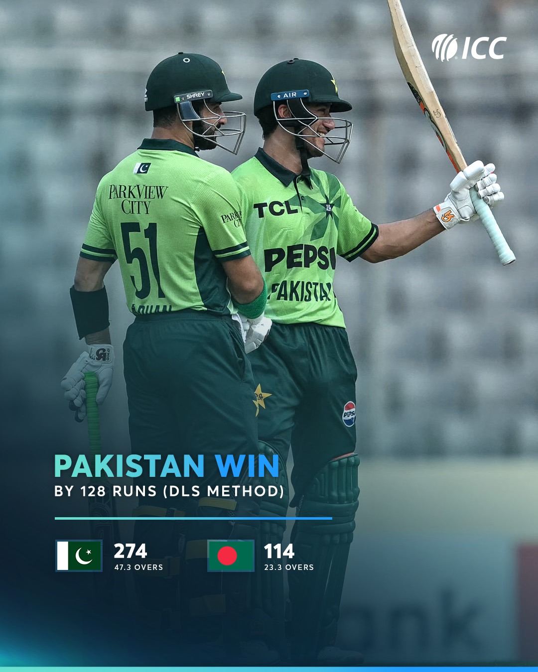பாகிஸ்தான் அணியினரின் துல்லிய பந்துவீச்சில் சிக்கி விரைவில் விக்கெட்களை இழந்தது.இதனால் வங்கதேச அணி 23.3 ஓவரில் 114 ரன்களுக்கு ஆல் அவுட்டானது. அதிகபட்சமாக லிட்டன் தாஸ் 41 ரன்னும், தவுஹித் ஹிருடோய் 28 ரன்னும் எடுத்தனர்.