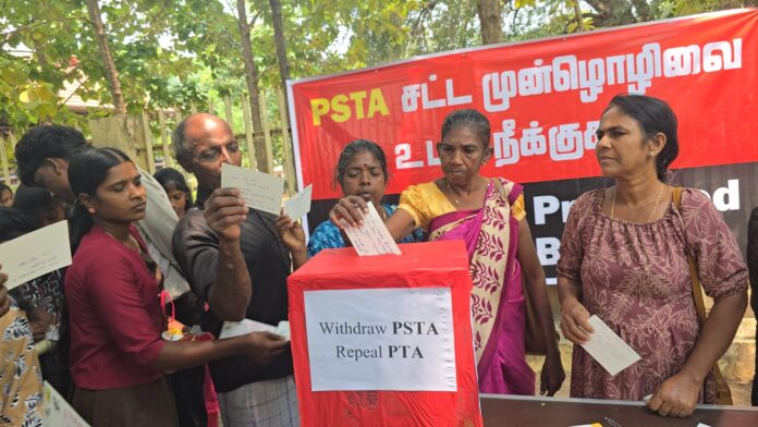 பயங்கரவாத எதிர்ப்புச் சட்ட மூலத்துக்கு எதிராக மக்களின் கருத்துக்களைத் திரட்டி, நீதி அமைச்சுக்கு அனுப்பி வைக்கும் விழிப்புணர்வு நடவடிக்கை இன்று யாழ்ப்பாணத்தில் முன்னெடுக்கப்பட்டது.