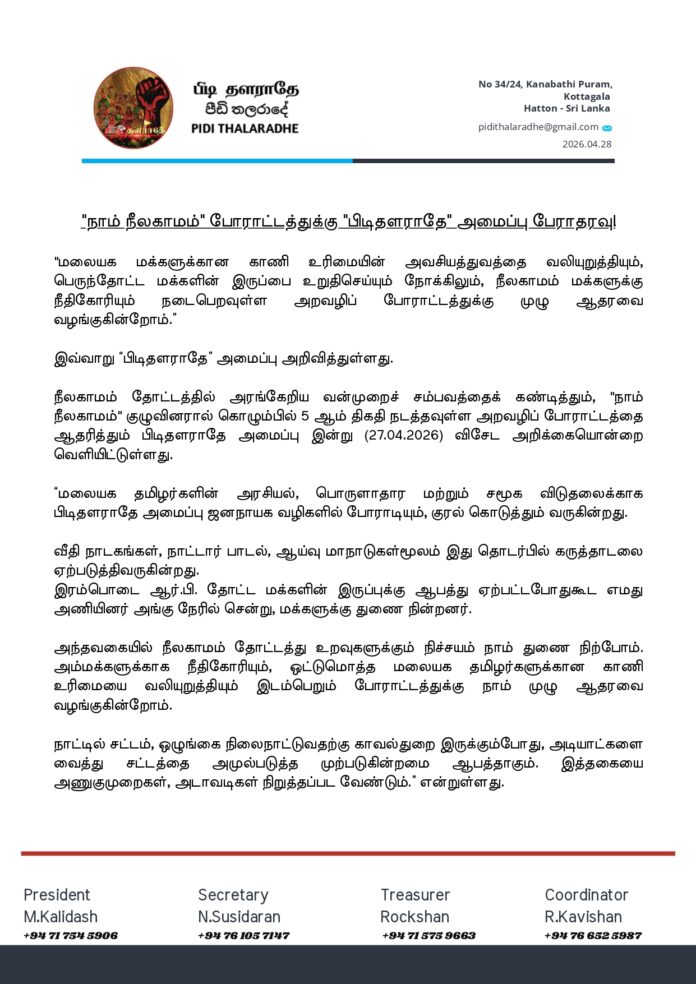 நீலகாமம் தோட்டத்தில் அரங்கேறிய வன்முறைச் சம்பவத்தைக் கண்டித்தும், “நாம் நீலகாமம்” குழுவினரால் கொழும்பில் 5 ஆம் திகதி நடத்தவுள்ள அறவழிப் போராட்டத்தை ஆதரித்தும் பிடிதளராதே அமைப்பு இன்று (27.04.2026) விசேட அறிக்கையொன்றை வெளியிட்டுள்ளது.