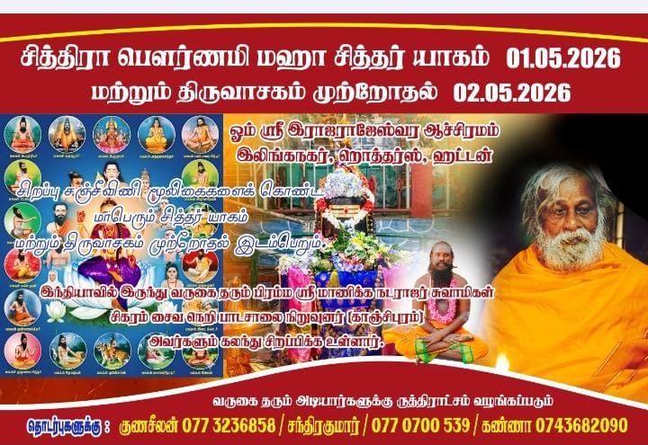 ஓம் ஸ்ரீ ராஜ ராஜேஸ்வர ஆஸ்ரமத்தின் குருநாதர் சுவாமி கணபதி அவர்களின் ஆசியுடன் எதிர்வரும் 01.05.2026 அன்று மாபெரும் சித்தர் யாகமும் அதனைத் தொடர்ந்து 02.05.2026 திருவாசகம் முற்றோதல் நிகழ்வும் இடம்பெற இருக்கிறது.