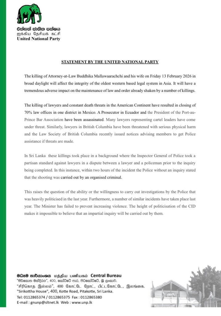 சட்டத்தரணி புத்திக மல்லவாரச்சி மற்றும் அவரது மனைவி ஆகியோர் சுட்டுப்படுகொலை செய்யப்பட்டுள்ள சம்பவத்தை ஐக்கிய தேசியக் கட்சி வன்மையாகக் கண்டித்துள்ளது.