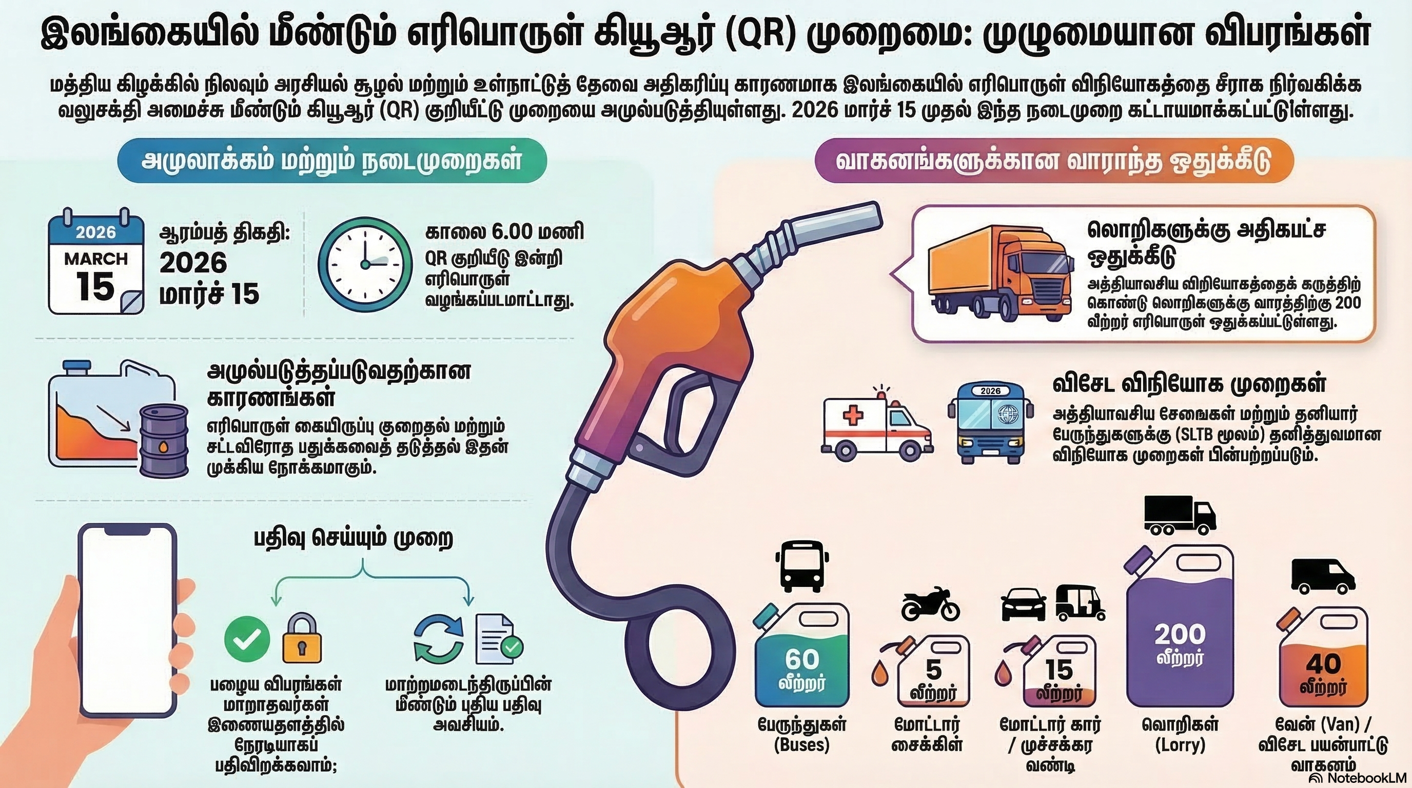 நுகர்வோர் மத்தியில் ஏற்பட்டுள்ள அசாதாரண கேள்வி மற்றும் சட்டவிரோதப் பதுக்கலைக் கட்டுப்படுத்தி, இருப்பிலுள்ள எரிபொருளைச் சீராக நிர்வகிப்பதே இந்த நடவடிக்கையின் முக்கிய நோக்கமாகும்.