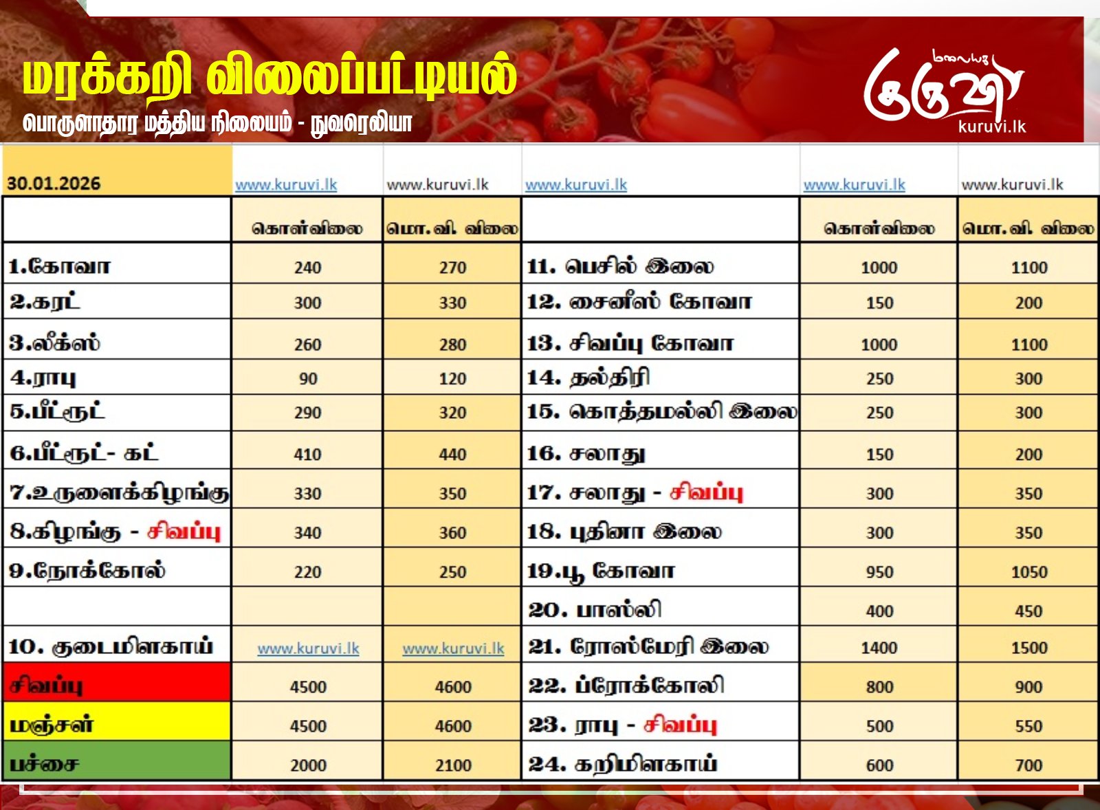 Homeஉள்நாடு உள்நாடுசெய்திவணிகம் மரக்கறி விலைப்பட்டியல் (30.01.2026) January 30, 2026 நுவரெலியா பொருளாதார மத்திய நிலையத்தால் இன்று (30) வெளியிடப்பட்டுள்ள மரக்கறி வகைகளின் (ஒரு கிலோ) விலை பட்டியல்… Share FacebookTwitterPinterestWhatsAppTelegramViber Related Articles உள்நாடு ஐக்கிய மக்கள் சக்தி மாநாட்டுக்கு முன் ரணில் – சஜித் நேரடி சந்திப்பு! சினிமா இந்தியாவில் ரூ.1,000 கோடி வசூலித்த முதல் இந்தி படம் – ‘துரந்தர்’ சாதனை உள்நாடு பழி தீர்க்குமா இலங்கை? முதலாவது டி20 போட்டி இன்று! Latest Articles உள்நாடு ஐக்கிய மக்கள் சக்தி மாநாட்டுக்கு முன் ரணில் – சஜித் நேரடி சந்திப்பு! சினிமா இந்தியாவில் ரூ.1,000 கோடி வசூலித்த முதல் இந்தி படம் – ‘துரந்தர்’ சாதனை உள்நாடு பழி தீர்க்குமா இலங்கை? முதலாவது டி20 போட்டி இன்று! உள்நாடு தேசிய இனப்பிரச்சினைக்கு சுயநிர்ணய உரிமை அடிப்படையில் தீர்வு அவசியம்! உள்நாடு ஹட்டன் பிரகடன உறுதிமொழிகள் எங்கே? ஜனாதிபதி கூறும் அதிகார சபையின் பின்புலம் என்ன? Load more