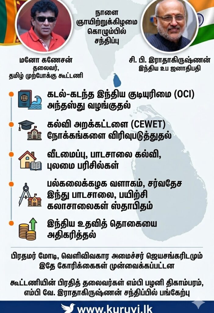கொழும்பில் நாளை ஞாயிற்றுகிழமை 19ம் திகதி, இந்திய உப ஜனாதிபதி சி. பி. இராதாகிருஷ்ணனுடன் இடம் பெற உள்ள சந்திபின் போது தமிழ் முற்போக்கு கூட்டனி சார்பில், முன்வைக்க உள்ள முன்மொழிவுகள் தொடர்பில் மனோ கணேசன் மேலும் கூறியவை வருமாறு,